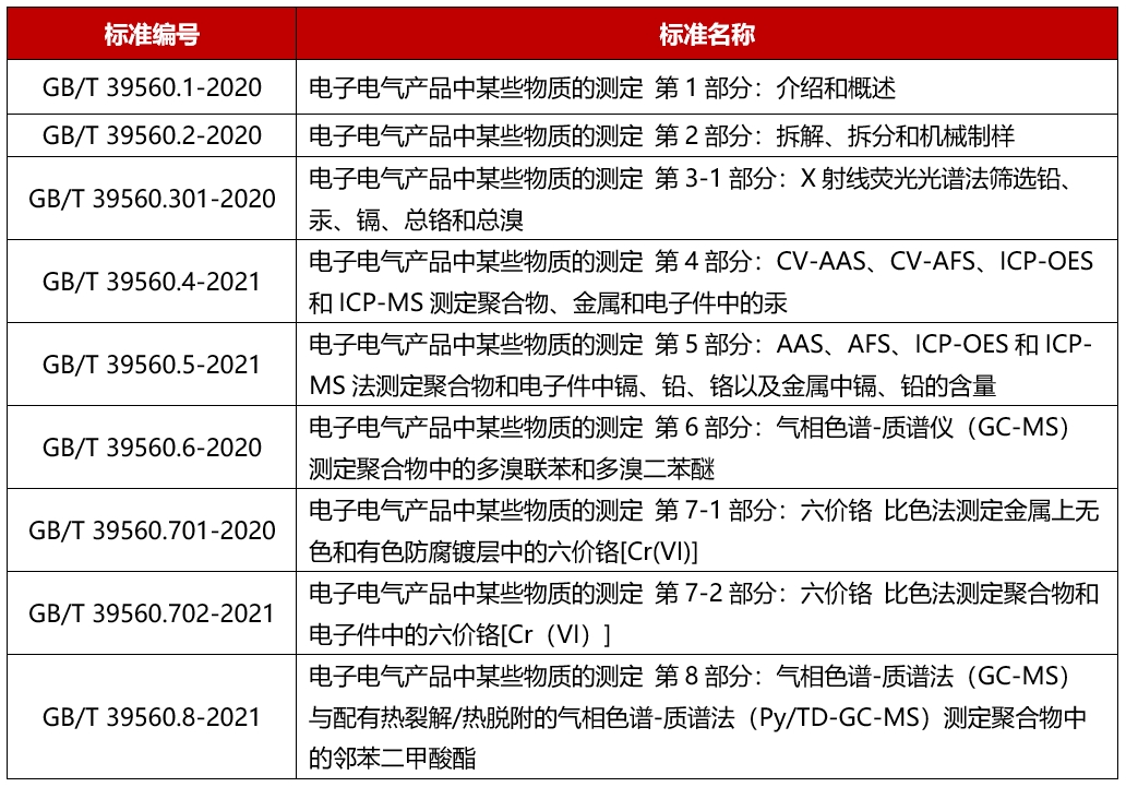 為與國際電器電子產(chǎn)品有害物質(zhì)檢測方法標準保持一致,暢通產(chǎn)業(yè)鏈供應鏈,服務(wù)貿易便利化,決定將電器電子產(chǎn)品有害物質(zhì)限制使用合格評定制度檢測方法標準由GB/T 26125《電子電氣產(chǎn)品 六種限用物質(zhì)(鉛、汞、鎘、六價(jià)鉻、多溴聯(lián)苯和多溴二苯醚)的測定》調整為GB/T 39560.1、GB/T 39560.2、GB/T 39560.301、GB/T 39560.4、GB/T 39560.5、GB/T 39560.6、GB/T 39560.701、GB/T 39560.702共8項關(guān)于電子電氣產(chǎn)品中某些物質(zhì)測定的系列標準(以下簡(jiǎn)稱(chēng)GB/T 39560系列標準)。