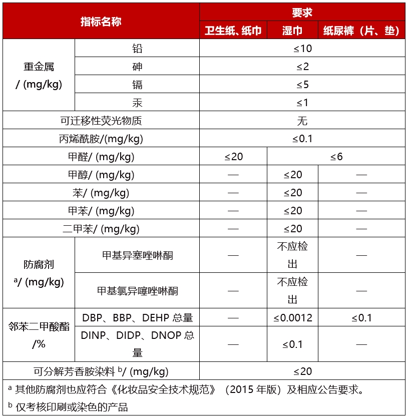 通過(guò)對產(chǎn)品原材料、生產(chǎn)工藝等進(jìn)行分析,結合國外同類(lèi)產(chǎn)品相關(guān)法規要求以及社會(huì )輿情情況,標準對嬰幼兒及兒童生活用紙品的重金屬、可遷移性熒光物質(zhì)、丙烯酰胺等指標規定了限量要求。