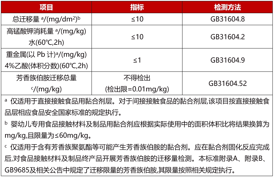 2. 食品接觸材料及制品用黏合劑應符合GB9685及相關(guān)公告對添加劑的SML、SML(T)、QM等理化指標的規定。