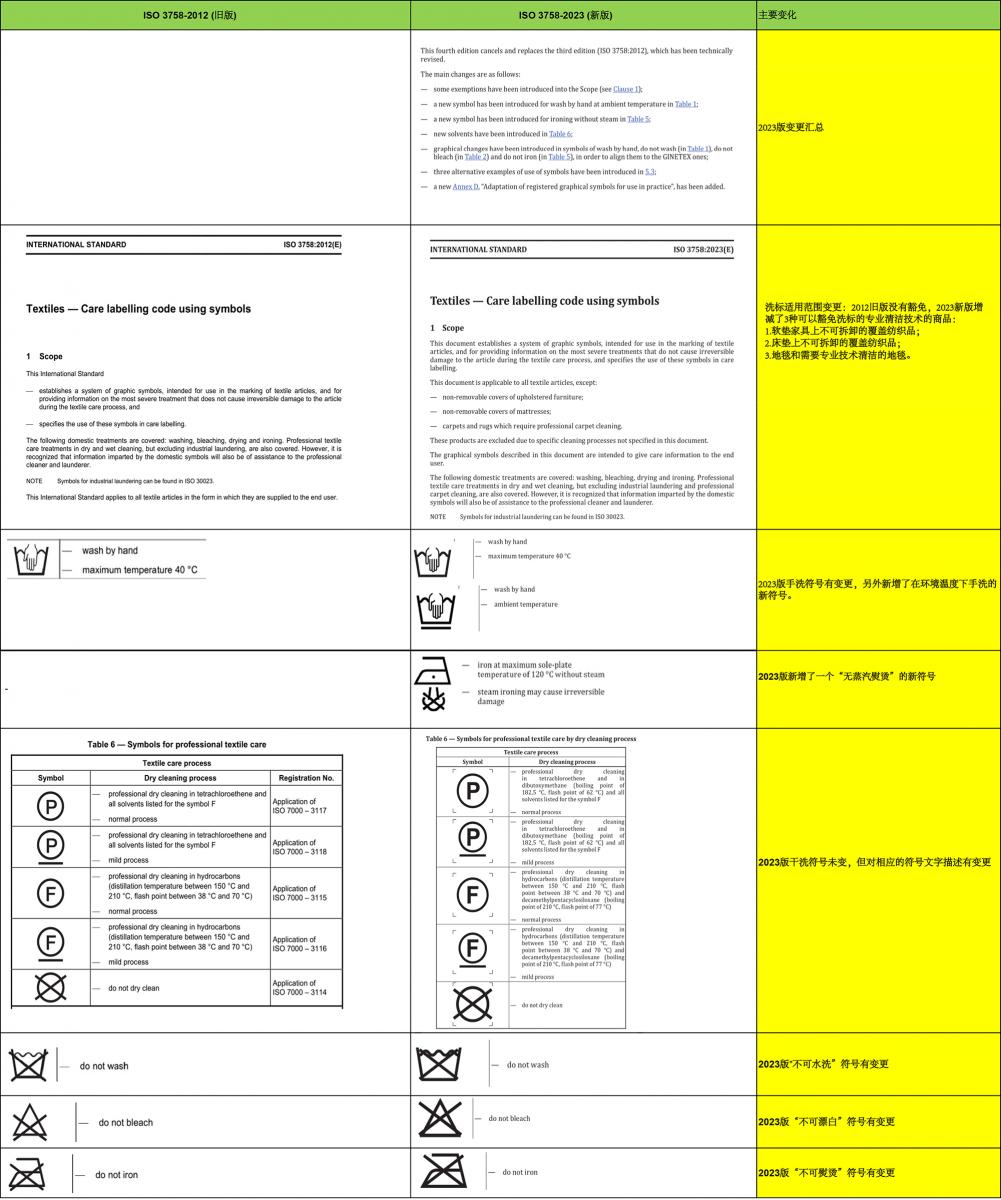 2023 年 12 月,ISO 發(fā)布了最新版本的護理標簽標準 ISO 3758:2023。這是該標準的第四版,取代了第三版 ISO 3758:2012。新版標準在舊版的基礎上有許多重要的變更,增加了豁免條款,一些主要洗標符號都有了更新。