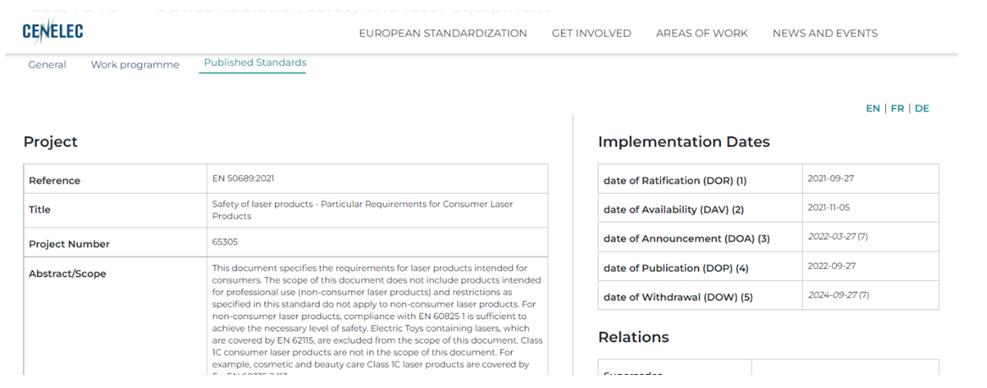 2022年3月27日,歐洲CENELEC發(fā)布激光產(chǎn)品的輻射安全標準 EN 50689:2021 Safety of laser products — Particular Requirements for Consumer Laser Products,