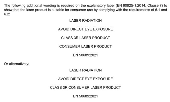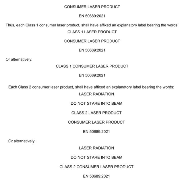 在較早發(fā)布的 EN 60825-1:2014+A11:2021 中規定,待 EN 50689 發(fā)布后,消費者激光產(chǎn)品必須要符合該標準。