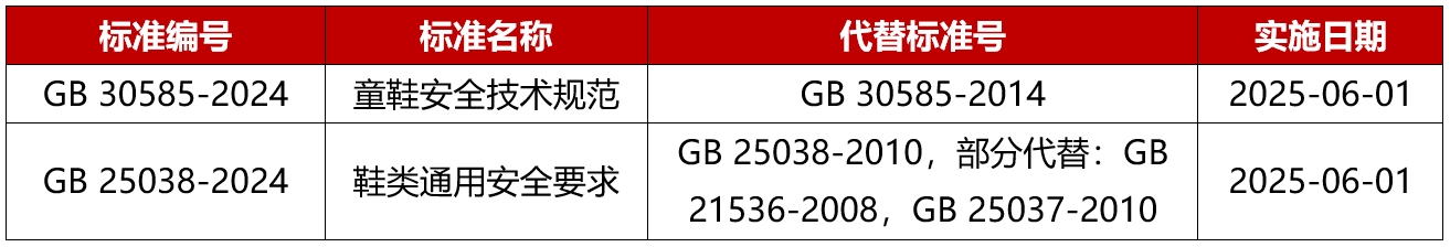 其中涉及2項鞋類(lèi)標準,包括GB 25038-2024《鞋類(lèi)通用安全要求》和GB 30585-2024《童鞋安全技術(shù)規范》,并均將于2025年6月1日正式實(shí)施。