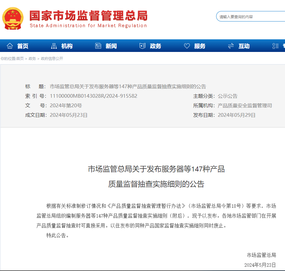 2024年05月29日,國家市場(chǎng)監督管理總局發(fā)布服務(wù)器等147種產(chǎn)品質(zhì)量監督抽查實(shí)施細則的公告。以往發(fā)布的同種產(chǎn)品國家監督抽查實(shí)施細則同時(shí)廢止。