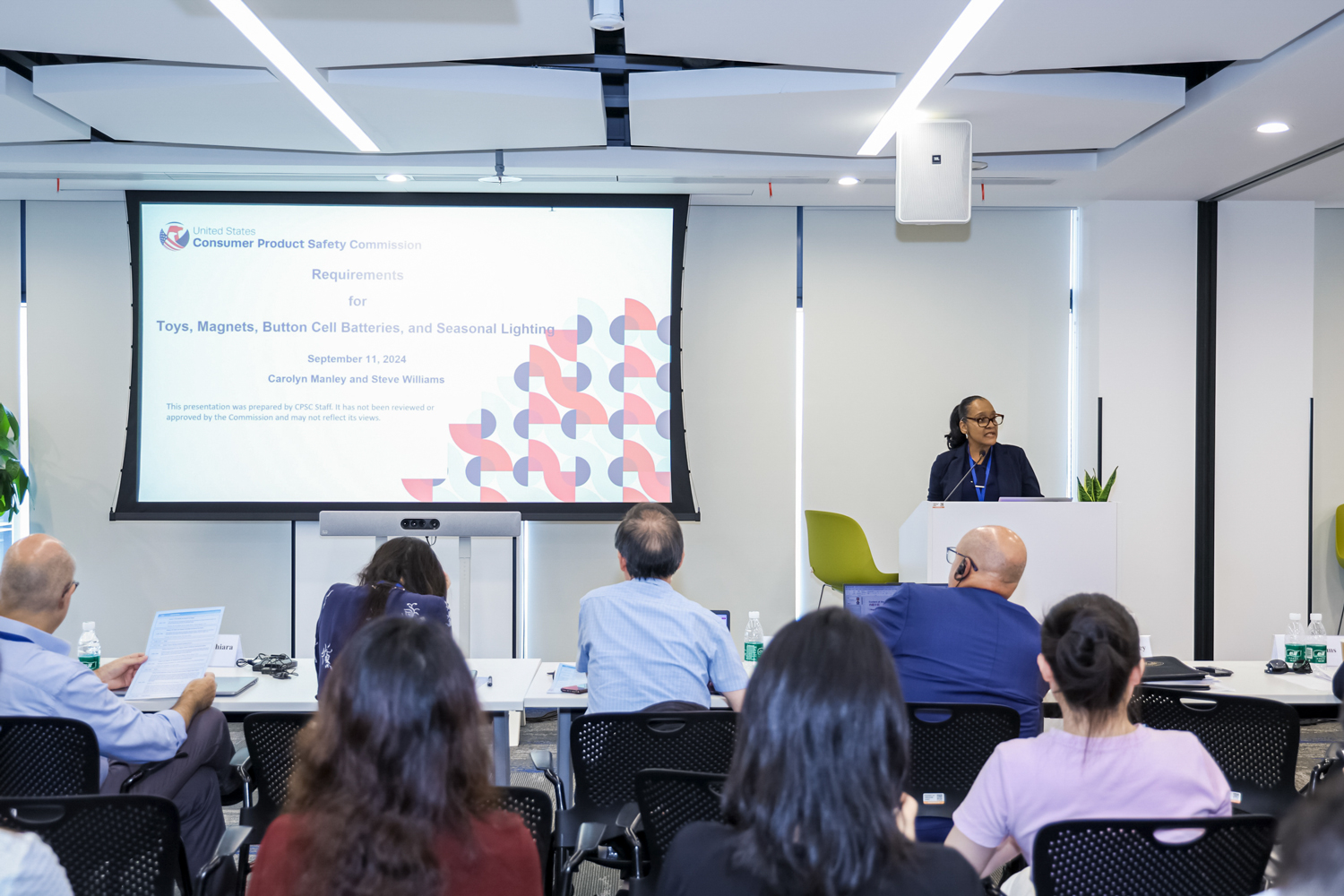本次研討會(huì )聚焦玩具、嬰童用品、磁鐵、鈕扣電池及節日彩燈等關(guān)鍵消費品領(lǐng)域,旨在為跨境電商企業(yè)精準傳達消費品線(xiàn)上銷(xiāo)售的合規政策,并強調在歐美市場(chǎng)出口產(chǎn)品時(shí)需遵守的法規和標準。會(huì )上,來(lái)自中、美、歐三個(gè)地區的資深產(chǎn)品安全專(zhuān)家,分別闡述了各自地區的消費品安全法規與市場(chǎng)監管框架,并對產(chǎn)品的合格評定、第三方檢測、召回等事項的不同要求進(jìn)行了深入解析。