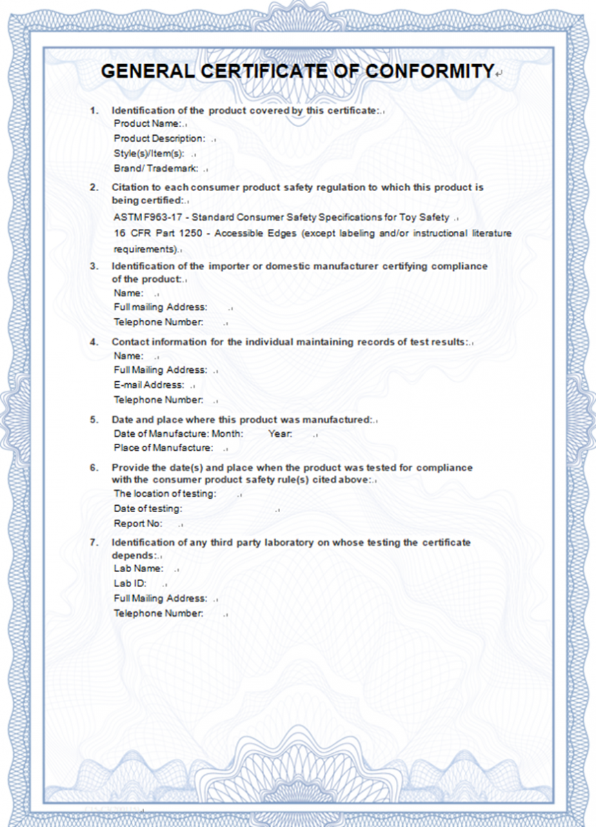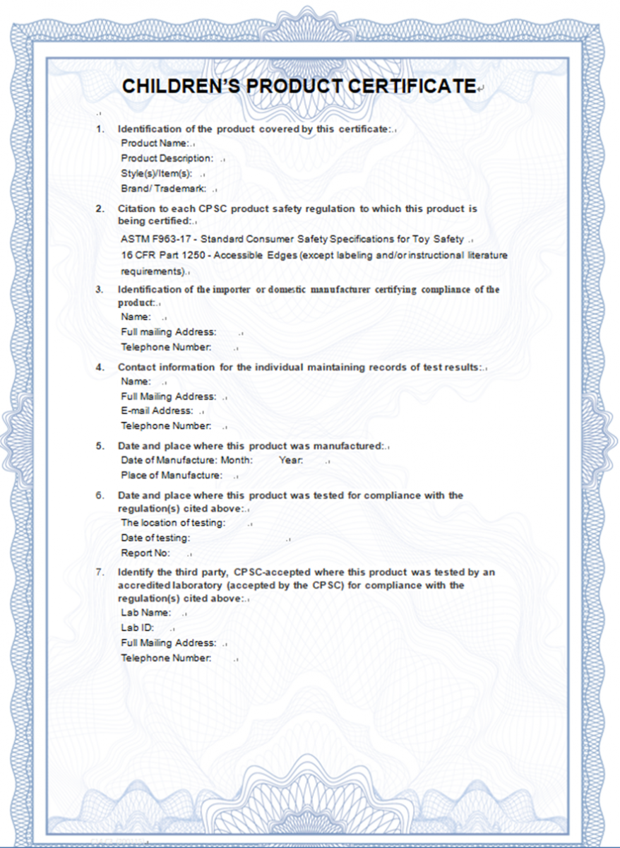 CPC 證書(shū)中的基本信息與GCC 證書(shū)不同的部分是:CPC 證書(shū)中的測試必須是由通過(guò)CPSC 認可的第三方實(shí)驗室出具的報告才有效。而GCC 證書(shū)中的測試不需要由通過(guò)CPSC 認可的第三方實(shí)驗室強制測試,可以由一般實(shí)驗室進(jìn)行測試。