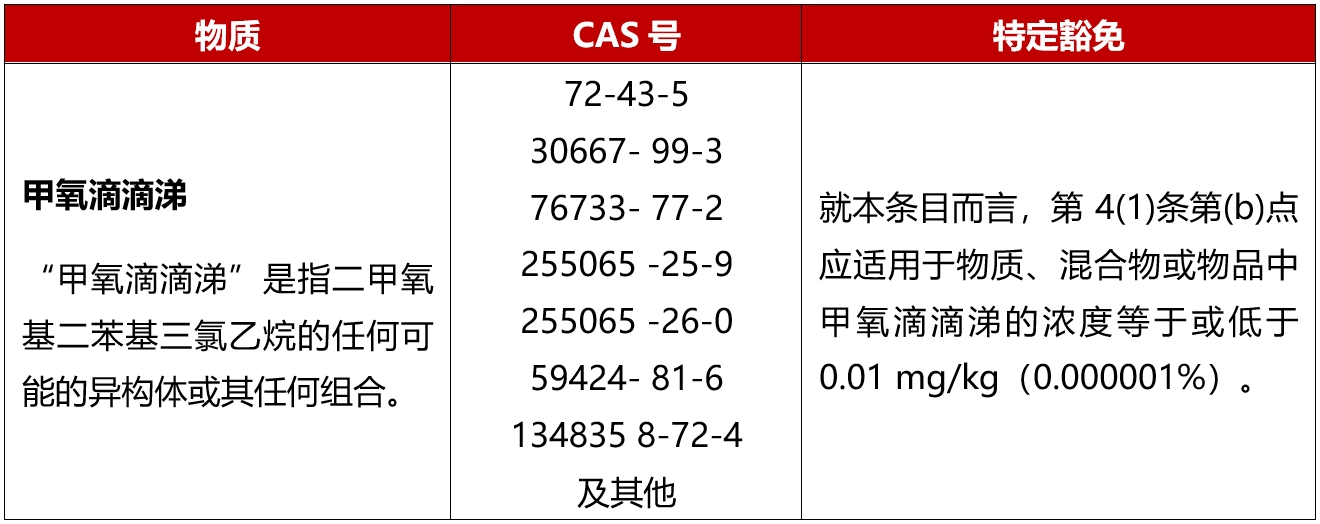 2024年9月27日,歐盟委員會(huì )在其官方公報上發(fā)布了歐盟POPs法規(EU) 2019/1021的修訂法規 (EU) 2024/2570,將甲氧滴滴涕(methoxychlor)納入歐盟POPs法規附錄Ⅰ的禁用物質(zhì)清單,該條例將于官方公報發(fā)布后的第20天起生效,也就是2024年10月17日起生效。至此,POPs法規附錄Ⅰ禁用物質(zhì)清單由29種增至30種。