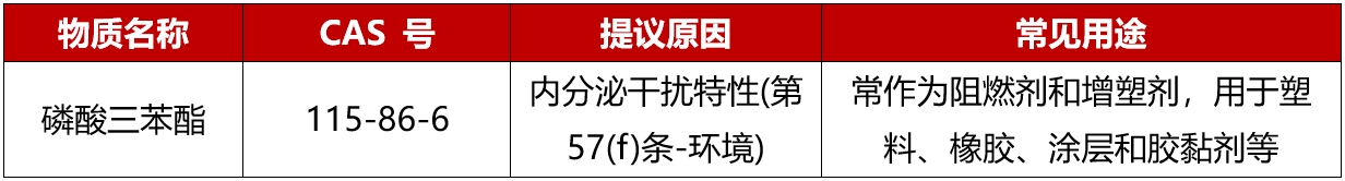 2024年10月16日,歐洲化學(xué)品管理局(ECHA)發(fā)布消息稱(chēng),歐盟成員國委員會(huì )(MSC)同意將之前暫緩加入高度關(guān)注物質(zhì)(SVHC)清單的磷酸三苯酯(TPP)認定為高度關(guān)注物質(zhì)。ECHA 將于11月初發(fā)布公告將該物質(zhì)正式列入SVHC清單,屆時(shí)SVHC清單將由241增至242項。