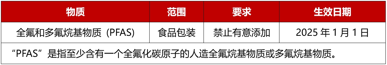 2024年9月,美國國會(huì )提議了H.R. 9864法案,即《2024年食品容器禁用PFAS法案》,修訂了《聯(lián)邦食品、藥品和化妝品法》(21 U.S.C. 331) 第301條,增加一項條款,自2025 年1月1日起禁止在州際貿易中引入或交付含有有意添加 PFAS 的食品包裝。