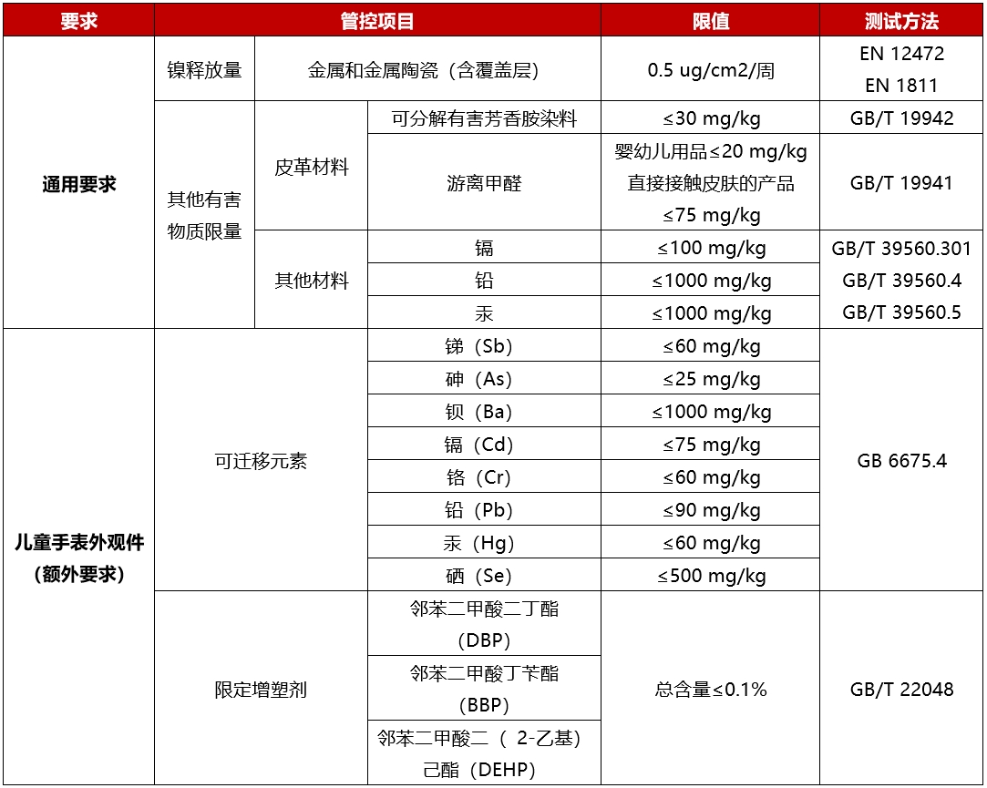 新標準明確了手表外觀(guān)件的通用要求,包括鎳釋放量、可分解有害芳香胺染料、游離甲醛及重金屬元素(鉛、鎘、汞)。除此以外,針對兒童手表外觀(guān)件,標準還提出了額外的可遷移元素及鄰苯二甲酸酯的限量要求。
