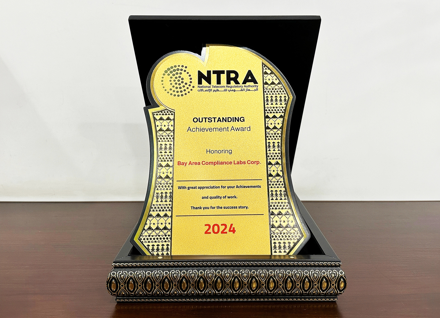 2024年11月,埃及國家電信管理局(NTRA)高級長(cháng)官Kareem Abdalla Elseadawy Daif及Ahmed Lotfy Maher Naguib Tawfek親臨BACL,為BACL頒發(fā)了 “2024年度杰出表現獎”!這是埃及NTRA官方對實(shí)驗室的最高獎項,是對BACL卓越的檢測能力以及出色的質(zhì)量檢驗的肯定。