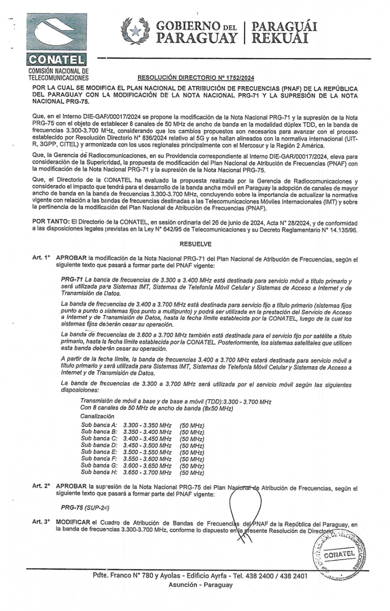 巴拉圭國家電信委員會(huì )(CONATEL)通過(guò)第1752/2024號決議修改了國家頻率歸屬計劃(PNAF),將3300-3700 MHz頻段分配給移動(dòng)業(yè)務(wù)。 PNAF確定3300-3400 MHz頻段、3600-3700 MHz頻段和3400-3700 MHz頻段的主要使用指配,并對3300-3700 MHz頻段進(jìn)行了如下修改:
