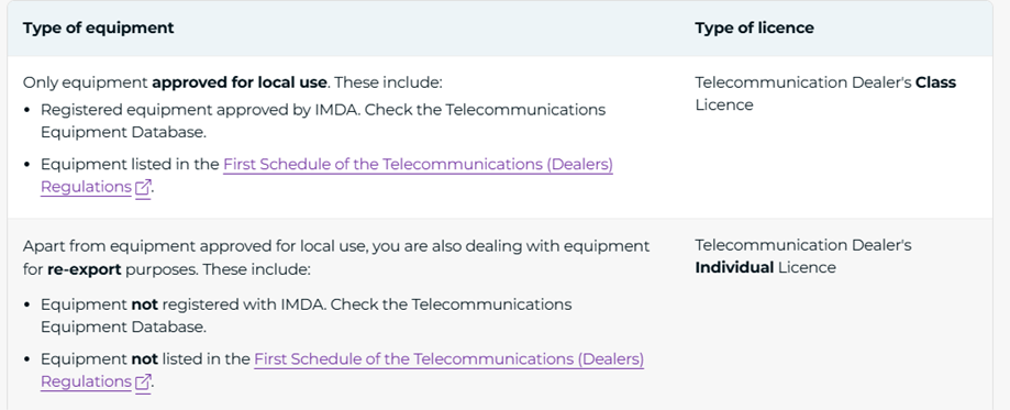 除非事先獲得 IMDA 的批準,否則不得進(jìn)口或再出口違禁設備。請致信 info@imda.gov.sg
