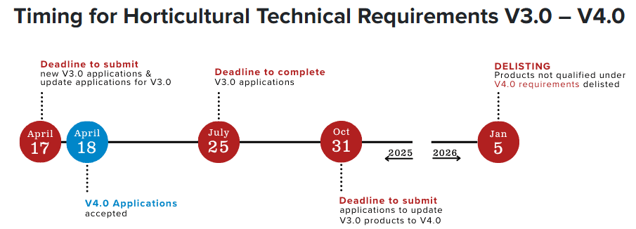 美國DLC在2025年3月12日發(fā)布了植物燈Hort V4.0的正式版,自2025年4月18日起生效(開(kāi)始申請),不滿(mǎn)足植物燈Hort V4.0新要求的產(chǎn)品將于2026年1月5日去除列名,其中Hort V3.0的申請截止時(shí)間為2024年4月17日,Hort V3.0升級為Hort V4.0的截止時(shí)間為2025年10月31日,同時(shí)產(chǎn)品不會(huì )自動(dòng)升級。DLC園藝照明技術(shù)要求旨在進(jìn)一步支持和加速CEA中節能照明和控制的采用,幫助引導行業(yè)實(shí)現可持續發(fā)展,同時(shí)努力實(shí)現脫碳。
