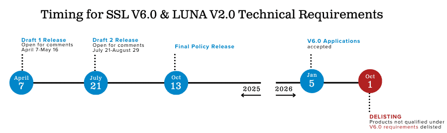 對于SSL V6.0和LUNA V2.0的實(shí)施時(shí)間表,DLC目前的計劃是2025年7月21日發(fā)布第二個(gè)草稿版,2025年10月13日發(fā)布正式版,2026年1月5日開(kāi)始接受SSL V6.0和LUNA V2.0的申請,不滿(mǎn)足SSL V6.0和LUNA V2.0新要求的的產(chǎn)品將在2026年10月1日在官網(wǎng)上去除列名。