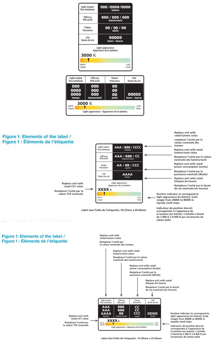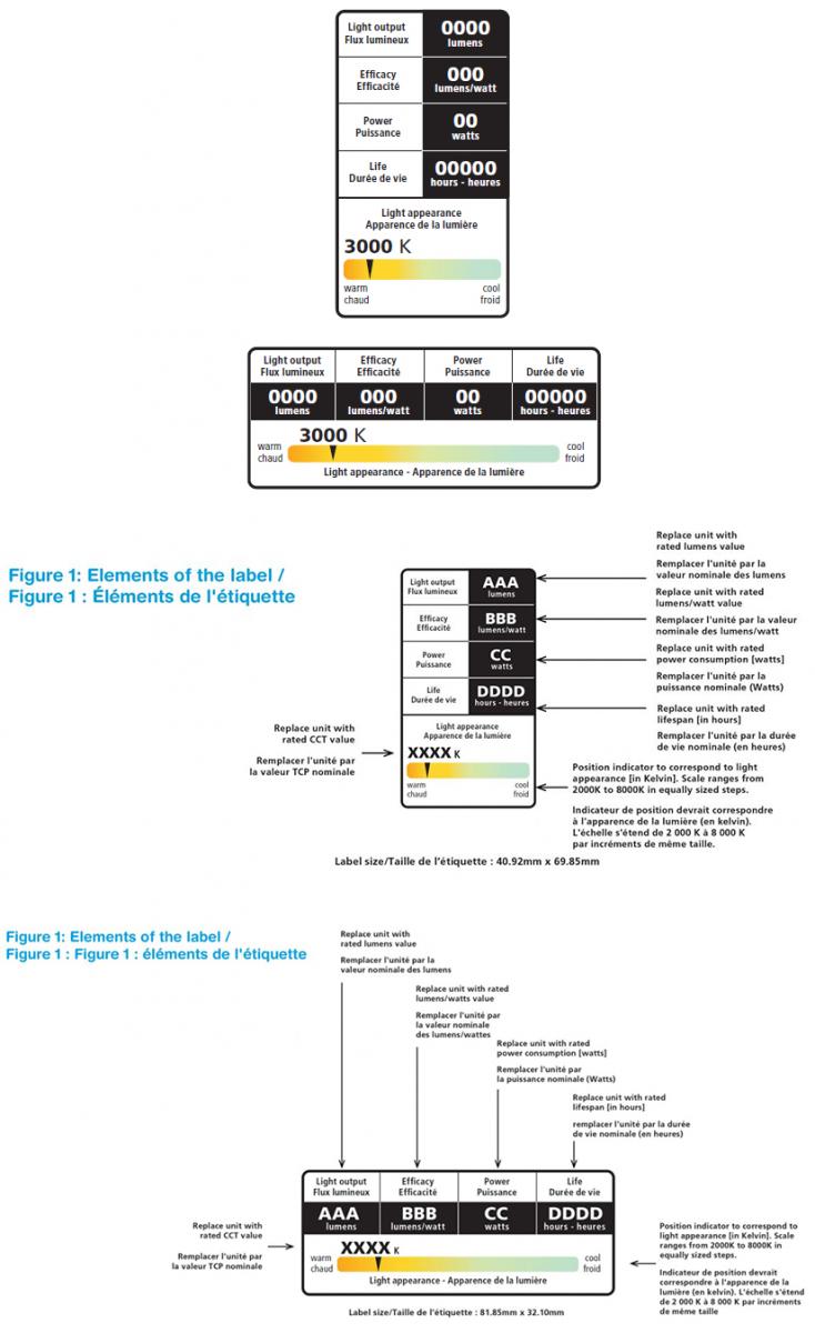 目前的標簽使用燈的光效作為效率的衡量標準,它還包括以流明為單位的光輸出,而不是傳統上使用的瓦數,作為亮度的衡量標準。新能效標簽將向加拿大消費者提供經(jīng)過(guò)驗證的可靠信息,并確保商品的性能符合規定要求。由于所有制造商都必須為在加拿大銷(xiāo)售的照明商品提供法語(yǔ)/英語(yǔ)雙語(yǔ)標簽,因此美國和加拿大的標簽始終存在差異,所有不考慮美國FTC標簽一致性。