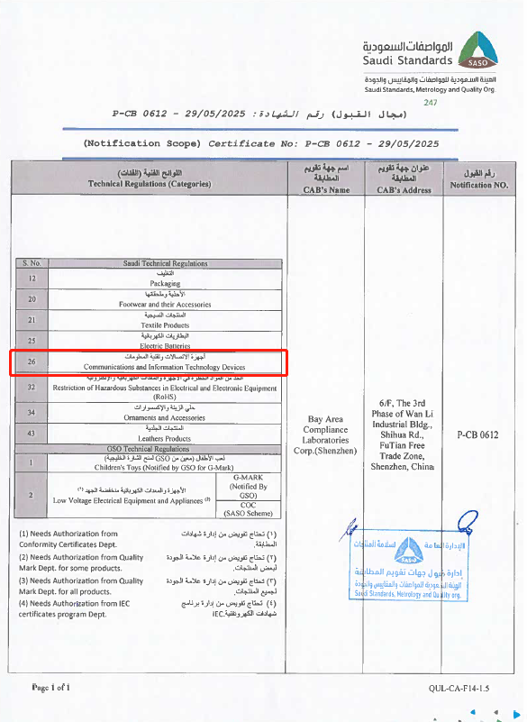 近日,BACL獲得沙特標準計量與質(zhì)量組織(SASO)官方認可,并成功取得沙特新通信和信息技術(shù)設備法規管控產(chǎn)品的檢測和發(fā)證資質(zhì)。